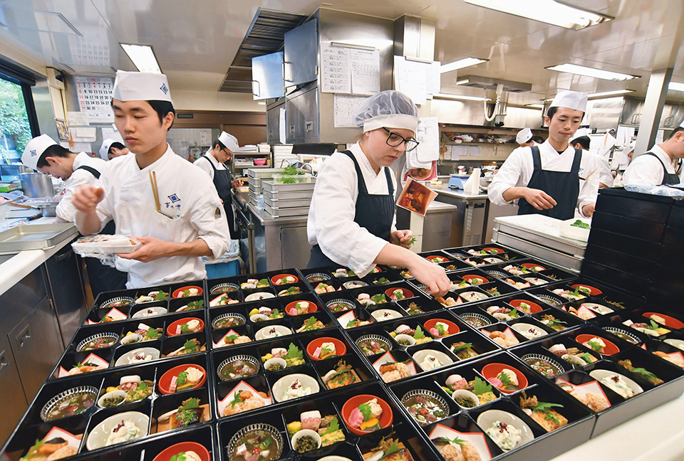 Jacquier arranging portions on bento lunch boxes in the kitchen. No knives are used in the early stage of training.
