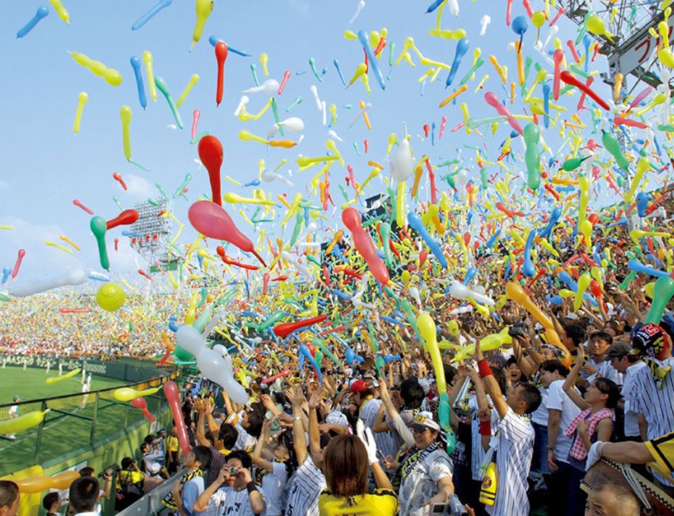 Fans send colorful balloons flying into the air at Koshien Stadium to cheer on the ballplayers.