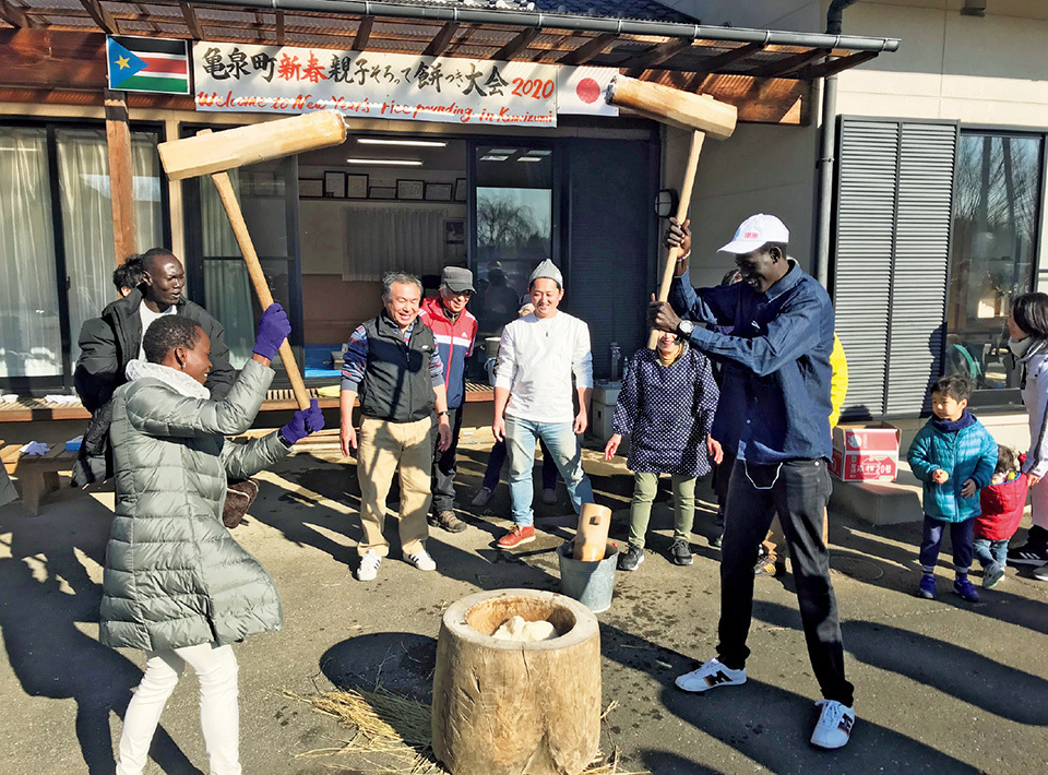 The South Sudanese team also has opportunities to experience Japanese culture. Here the athletes try their hands at pounding mochi.