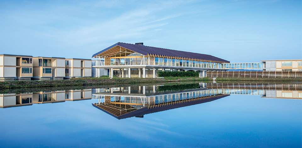 The Shonai Hotel Suiden Terrasse, built from wood, was designed by the prominent Japanese architect BAN Shigeru. Suiden means paddy, or rice field. The hotel, built to look as if it is floating amidst rice paddies, is a new attraction that adds to the appeal of Tsuruoka City.