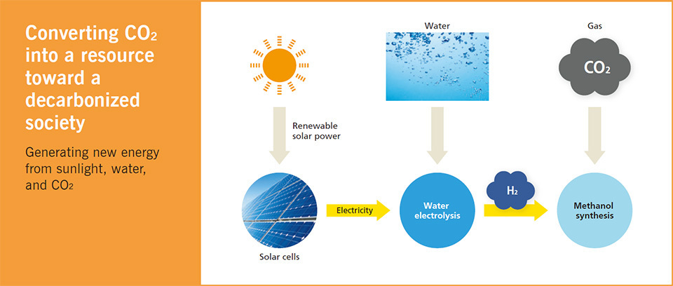Fuel can be produced by combining the hydrogen produced from solar energy with greenhouse gases emitted by humans. A method to convert CO2 into energy has been proposed by Dr. FUJISHIMA Akira, the discoverer of photocatalysis.