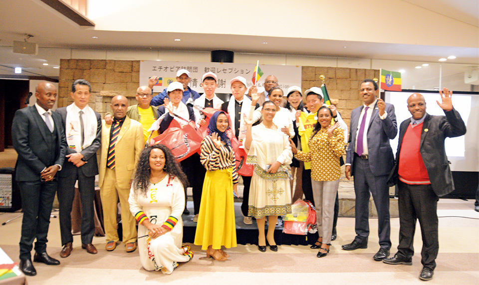 Ministers and Olympic medalists from Ethiopia shown while visiting Japan for the Kasama Togeinosato Half Marathon held in 2019. Running together with Mekonnen, they established good relationships with the people of Kasama.