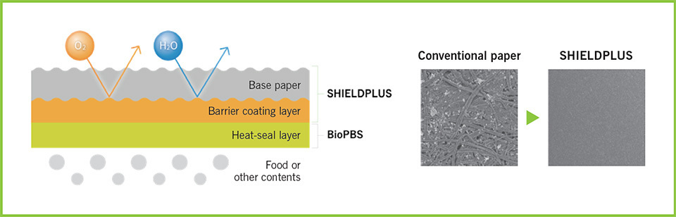 Even when SHIELDPLUS is used as a food package, a thin plastic film is still needed to seal the inside so as to protect the quality of the contents. For that, Nippon Paper Industries, in a new deal, has utilized BioPBS, a biodegradable resin developed by Mitsubishi Chemical Corporation. The two companies have co-developed a new recyclable packaging material using BioPBS as a heat-seal layer. Each component, made from recyclable materials, is thus biodegradable. Together, they effectively prevent the deterioration of the package’s contents.