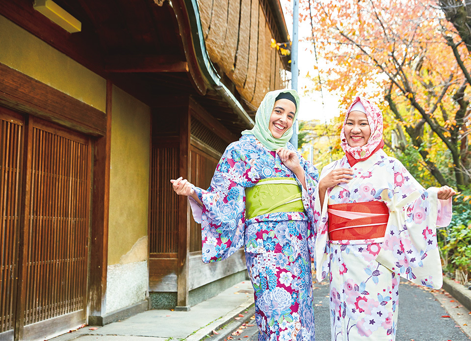Since the wagara hijab was introduced at Yumeyakata, more and more inquiries have come from Southeast Asia, as well as Europe, the United States and the Middle East. At Yumeyakata, Mansour and Aryanto are now busy with many things, such as giving advice to customers on how to wear the wagara hijab and kimono, as well as providing guided walks around Kyoto dressed in kimono, and offering tea ceremony experiences. Speaking of her goal, Mansour says, “I want more foreigners to enjoy getting dressed up in Japanese clothes regardless of where they’re from or their religion, to understand the beauty of Japan that is so different from that of the West. It’s because of this that I want to introduce the wagara hijab to a lot of people.”