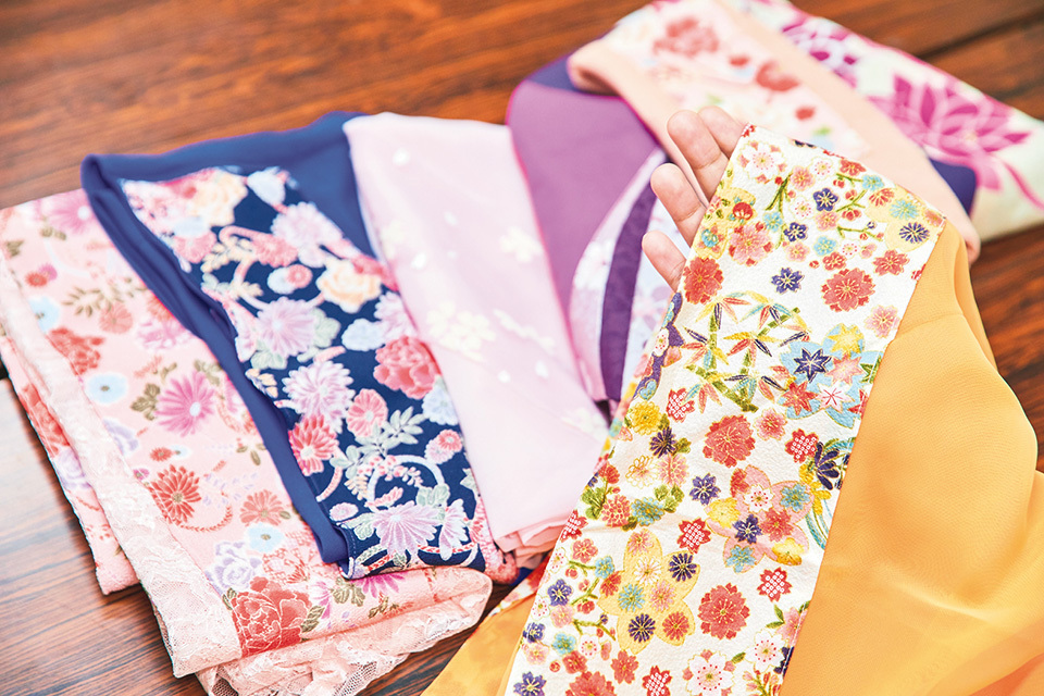 To accommodate for Muslim customers, Yumeyakata brought in Muslim staff and set up a prayer room in 2018. Consequently, the store began receiving questions, on an almost daily basis, from Muslim women on how best they could coordinate their hijabs with a kimono. At first, the store asked customers to bring in their daily-use hijabs, which are typically plain, to be complemented with the colors of the kimono sash. However, to enable visitors to enjoy the pairing of the kimono and hijab much more, the shop has been providing specially-made hijabs since 2019, adorned with wagara that can be worn in combination with the Japanese kimono.